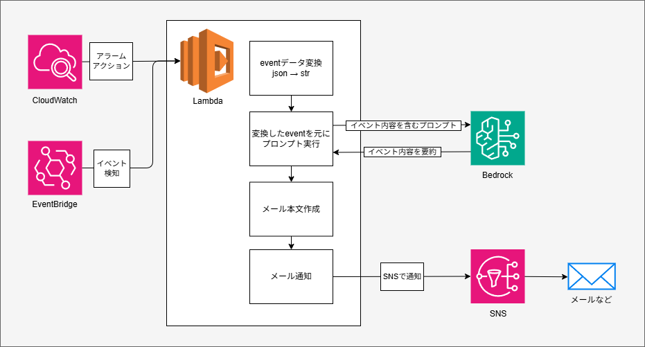 今回の記事では、この「SNS通知が分かりづらい」という課題を解決するために、Amazon Bedrockを利用して通知内容を自動で要約し、より分かりやすい形でメール通知する仕組みを紹介します。