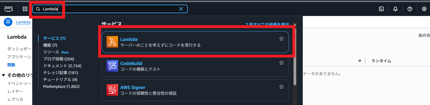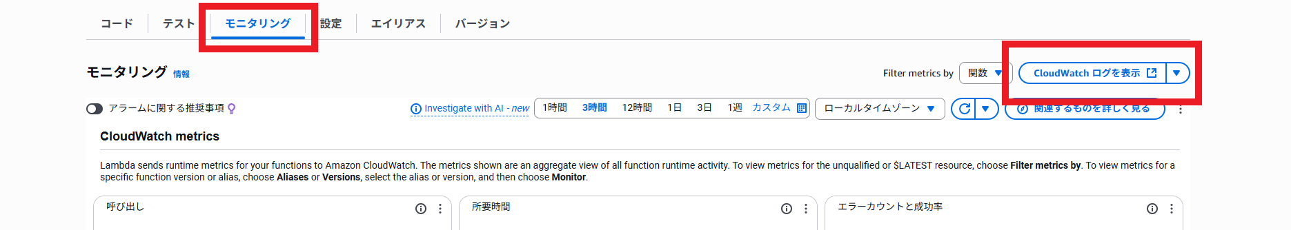 作成したLambda関数を開きます。「モニタリング」タブを選択し、「CloudWatchログを表示」をクリックしてください。