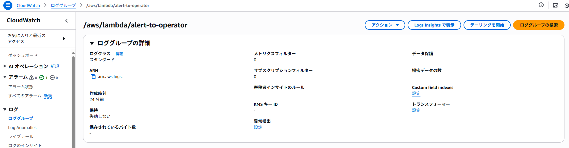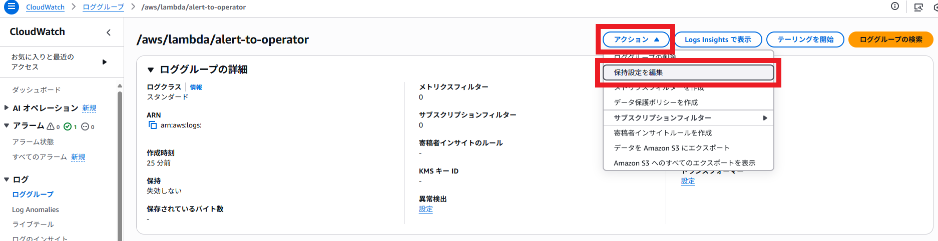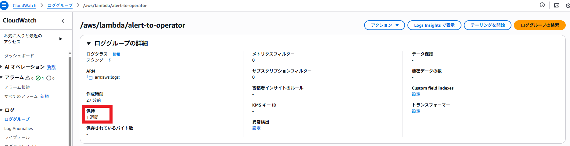 本設定はLambda関数の初回実行後(厳密に言うとロググループ作成後)に可能です。