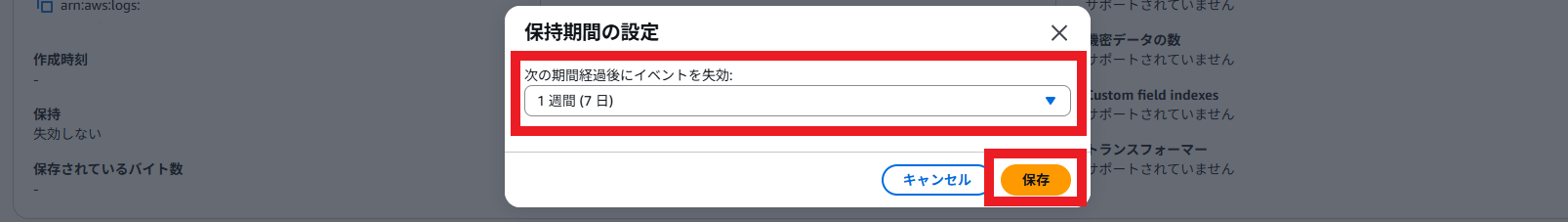 初期設定だと保持期間が無制限となっています。ちりつもですが、長期間利用すると想定外の課金につながる可能性があるため、保持期間を設定しておきましょう。